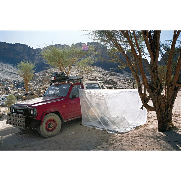 Box shaped net from finest and particularly light Polyamid. The thin thread makes – despite the mesh size – a relatively good circulation possible. Model I and II are small and have optimal luggage measure and weight. ‘Big’ is big enough also for large double beds. Closed all around (no bottom).