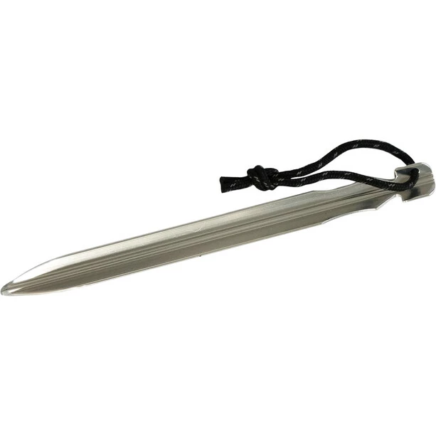 6 pegs made of DUR Aluminium, suitable for soft to medium hard floors. The cord gives good access when pulling out the peg.